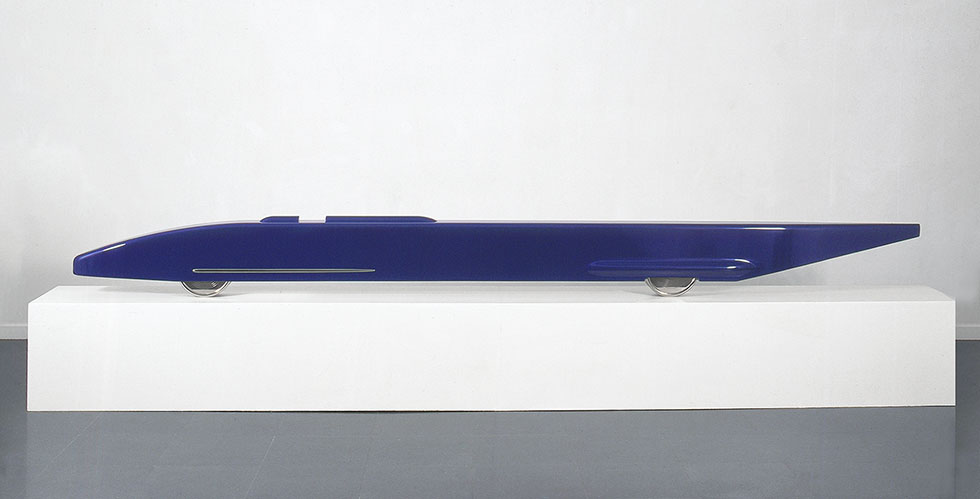 Painted epoxy fiberglass on canvas on wood, chrome-plated brass